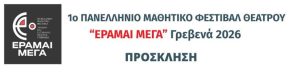 Τα Γρεβενά ετοιμάζονται να υποδεχθούν τη νέα γενιά δημιουργών στο πλαίσιο του 1ου Πανελλήνιου Μαθητικού Φεστιβάλ Αρχαίου και Σύγχρονου Θεάτρου με τον τίτλο «ΕΡΑΜΑΙ ΜΕΓΑ»....