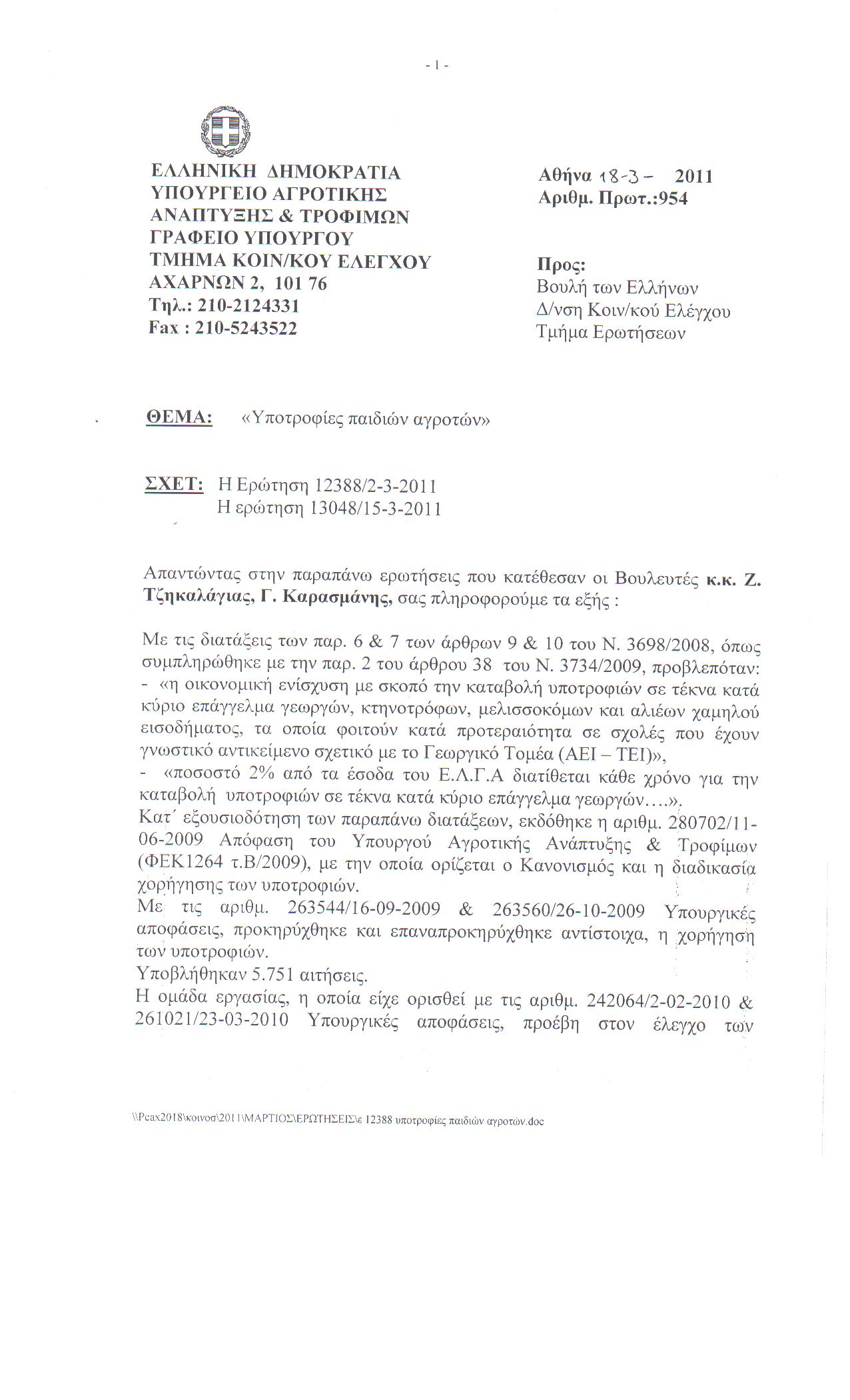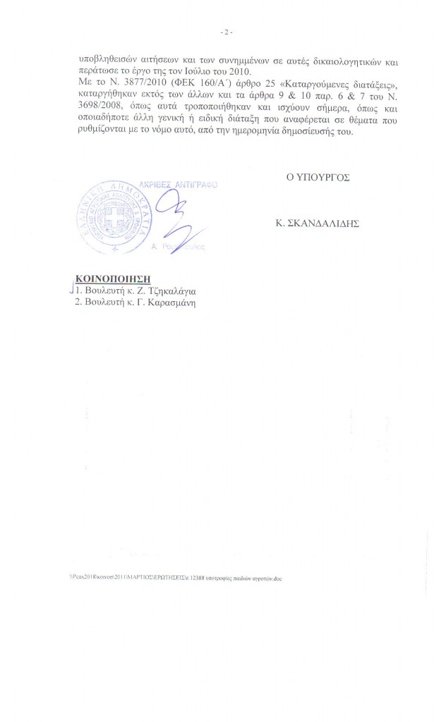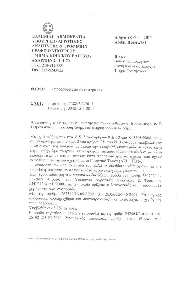 Είναι γνωστό πως επί σειρά ετών, με πρωτοβουλία της προηγούμενης κυβέρνησης της Νέας Δημοκρατίας, χορηγούνταν υποτροφίες σπουδών σε τέκνα αγροτών. Με την αλλαγή της κυβέρνησης τον Οκτώβριο του 2009, η διαδικασία πάγωσε, με αποτέλεσμα 5.751 αιτήσεις να βρίσκονται κυριολεκτικά «στον αέρα». Ο Αν. Γραμματέας της Κ.Ο. της Νέας Δημοκρατίας και βουλευτής Καστοριάς κ. Ζήσης Τζηκαλάγιας, αντιλαμβανόμενος το μέγεθος του προβλήματος και με δεδομένο πως οι δικαιούχοι των εν λόγω υποτροφιών είναι τέκνα ανθρώπων του μόχθου που με στερήσεις και θυσίες σπουδάζουν τα παιδιά τους, κατέθεσε στις 15 Μαρτίου 2011 Ερώτηση προς τον Υπουργό Αγροτικής Ανάπτυξης & Τροφίμων κ. Κ. Σκανδαλίδη, προκειμένου να πληροφορηθεί τις προθέσεις της ηγεσίας του Υπουργείου για το θέμα. Ο κ. Υπουργός απάντησε στο βουλευτή με την υπ. αριθμ. 954-18/3/2011 απάντησή του που του κοινοποιήθηκε στη θυρίδα του στη Βουλή στις 31/3/2011. Διαβάζοντας την απάντηση του κ. Σκανδαλίδη, με μεγάλη μας λύπη διαπιστώνουμε πως η σοσιαλιστική κι φιλολαϊκή κυβέρνηση του ΠΑ.ΣΟ.Κ. με ιστορικό «φιλολαϊκών» μέτρων κατά το παρελθόν όπως το «Τσοβόλα δώστα όλα», αποφάσισε να πάει στο άλλο άκρο υιοθετώντας το «Σκανδαλίδη πάρτα όλα». Σε αυτά τα πλαίσια, έσπευσε να ψηφίσει το νόμο 3877/2010 (ΦΕΚ 160/Α΄) άρθρο 25 σύμφωνα με τον οποίο καταργούνται όλες αυτές οι ευεργετικές διατάξεις του νόμου 3698/2008 που είχε ψηφίσει η Νέα Δημοκρατία.