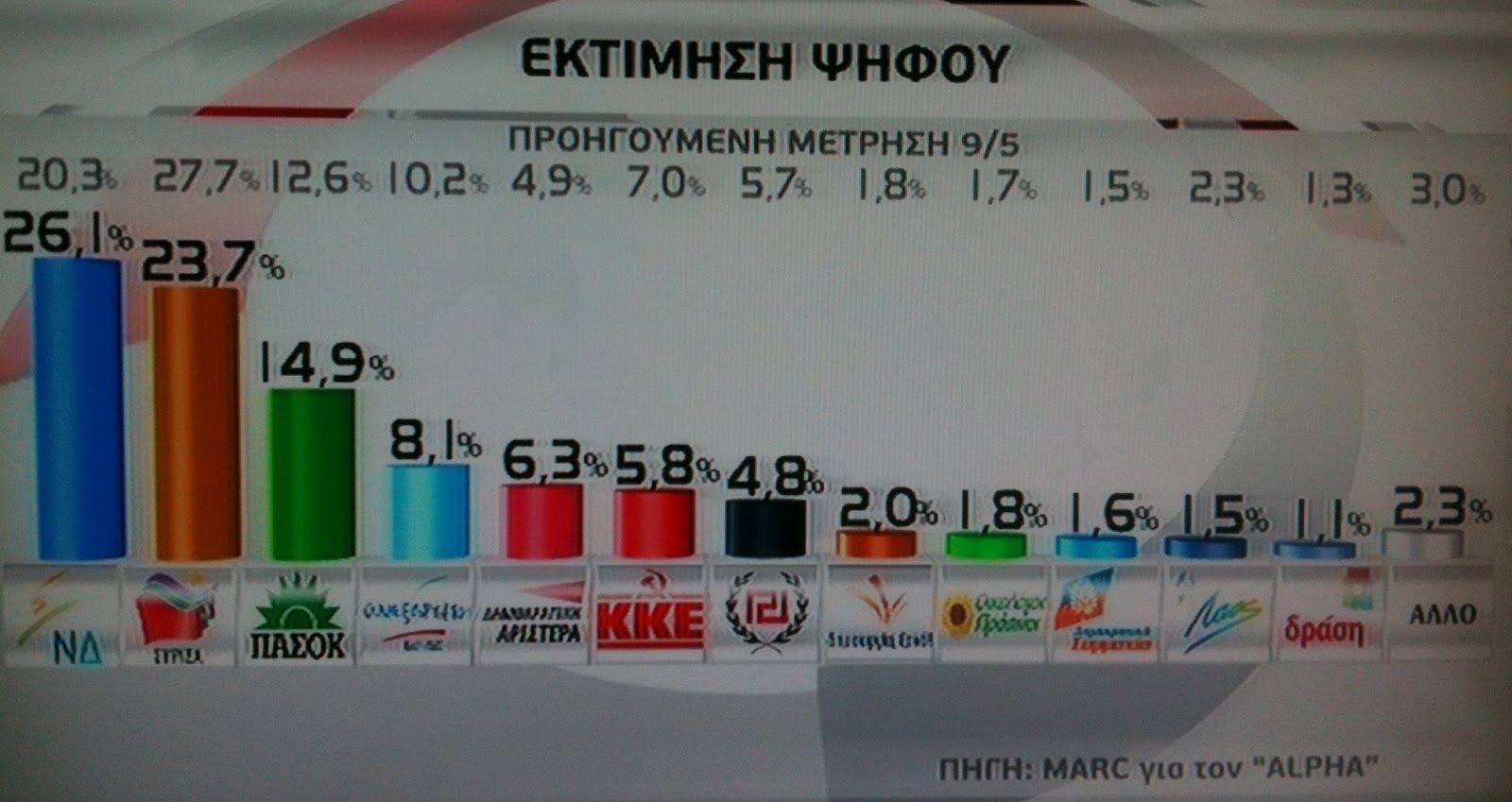 Η δημοσκόπηση αυτή ανατρέπει πλήρως το πολιτικό σκηνικό που είχε καταγραφεί στην προηγούμενη δημοσκόπηση της Marc για τον ALPHA τέσσερις ημέρες μετά το εκλογικό αποτέλεσμα της 6ης Μαΐου, σύμφωνα με την οποία στην πρόθεση ψήφου ο ΣΥΡΙΖΑ συγκέντρωνε 23,8% και ακολουθούσαν η ΝΔ με 17,4%, το ΠΑΣΟΚ με 10,8%, οι Ανεξάρτητοι Έλληνες με 8,7%, το ΚΚΕ με 6%, η Χρυσή Αυγή με 4,9% και η Δημοκρατική Αριστερά με 4,2%.