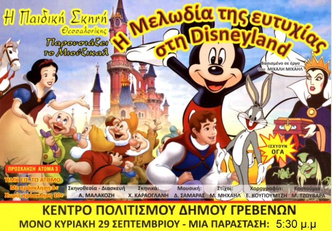 Η παιδική σκηνή Θεεσαλονίκης, παρουσιάζει – σε μία και μόνο παράσταση- την Κυριακή 29 Σεπτεμβρίου, στο Κέντρο Πολιτισμού του Δήμου Γρεβενών, στις 5:30 μμ, την παράσταση: Η μελωδία της ευτυχίας στη Disneyland .