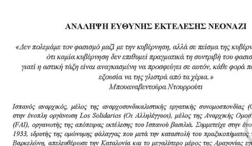 Το κείμενο καταλήγει «Φωτιά και τσεκούρι στους φασίστες».
