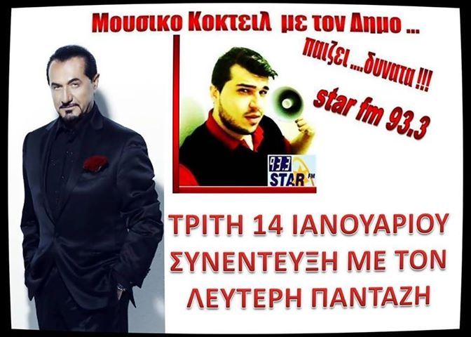 Καλεσμένος αυτη τη Τρίτη 14 Ιανουαρίου ο μοναδικος Λευτέρης Πανταζής που κάνει ποδαρικό στην πρώτη εκπομπη για το 2014 με μια αποκλειστικη και αποκαλυπτική συνεντευξη μόνο στο «Μουσικό Κοκτέιλ με τον Δήμο» 3 με 5 το μεσημερι και σε επαναληψή 7 με 9 το απόγευμα στον Star-fm 933