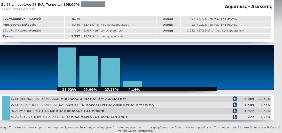 Στον Δήμο της Δεσκάτης όλα θα κριθούν την επόμενη Κυριακή αφού οι συνδυασμοί των Χρήστου Μπγιάλα και Δημήτρη Καραστέργιου συγκέντρωσαν 38,62 % και 29,66% αντίστοιχα. Στην τρίτη θέση ο νυν Δήμαρχος Νίκος Μίγκος με 27,57% και στην τέταρτη θέση η Μαρία Τζιώλα με 4,14%.