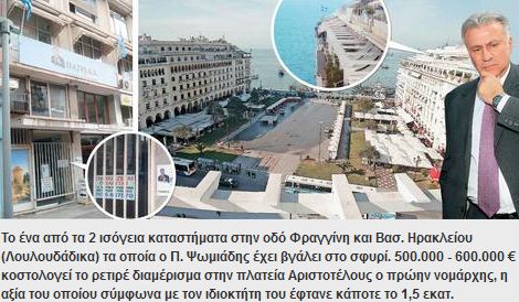 «Κάποιοι δυστυχώς θεωρούν ότι πρέπει να χαρίσω τα ακίνητά μου. Εγώ είπα ”τα σκοτώνω”. Δεν πρόκειται να τα χαρίσω» είναι τα λόγια του. Ιδιαίτερα για το προνομιακό ρετιρέ της Πλατείας Αριστοτέλους (επιφάνειας 90 τ.μ.), που βρίσκεται λίγες δεκάδες μόλις μέτρα από το ξενοδοχείο «Ηλέκτρα Παλλάς» και άλλο τόσο από τη θάλασσα και διαθέτει μοναδική θέα, ο Π. Ψωμιάδης λέει ότι «μέχρι χθες έκανε 1,5 εκατ. ευρώ και το πουλούσες όσο ήθελες, ενώ τώρα το πουλάς 500.000-600.000 ευρώ, σκοτώνοντάς το».