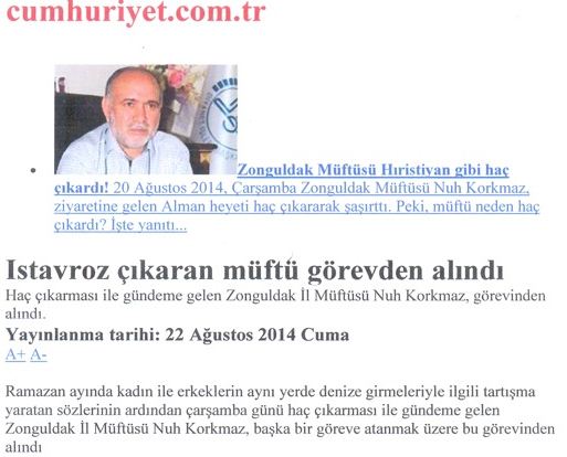 Σύμφωνα με τα ίδια τα δημοσιεύματα των τουρκικών ΜΜΕ, ο Nuh Korkmaz, μουφτής της πόλεως του Zonguldak, στον δυτικό Πόντο, επειδή έφερε στο στήθος του ένα χριστιανικό σταυρό σαν να είναι χριστιανός και τον οποίο δεν δίστασε να επιδείξει σε ξένους επισκέπτες στην πόλη του, μόλις έγινε γνωστή αυτή του η πράξη απελύθη από τα καθήκοντα του στο τέμενος της πόλης του Zonguldak. Μάλιστα η απόλυση του σαν θρησκευτικού λειτουργού της μουσουλμανικής θρησκείας, δημοσιεύτηκε και στην επίσημη εφημερίδα της Διεύθυνσης Θρησκευτικών Υποθέσεων της Τουρκίας.