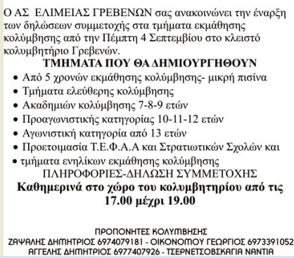 ΑΘΛΗΤΙΚΟΣ ΣΥΛΛΟΓΟΣ ΓΡΕΒΕΝΩΝ ΕΛΙΜΕΙΑ-ΚΟΛΥΜΒΗΣΗ-3Ξεκινά την λειτουργία του ο νέος κολυμβητικός σύλλογος Γρεβενών με την επωνυμία “Ελιμεία” έχοντας μαζί του έμπειρους και γνώριμους γυμναστές.