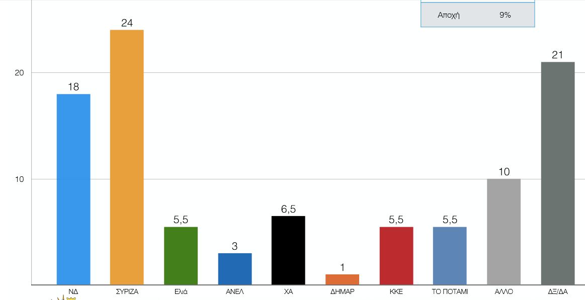 Ο ΣΥΡΙΖΑ βρίσκεται στην πρώτη θέση με 24%, με τη ΝΔ να ακολουθεί με ποσοστό 18%.