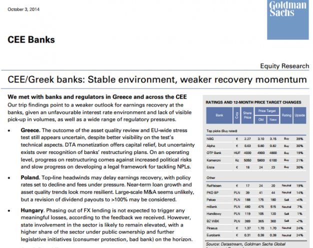 Παράλληλα η έρευνα που έχει κάνει η Goldman δείχνει ότι δεν πρόκειται σύντομα να πωληθούν μερίδια του ΤΧΣ, είτε να αναδιαρθρωθούν τα warrants. Αλλαγές μπορεί να υπάρχουν από το 2016. Η πολιτική αβεβαιότητα θεωρείται διαχειρίσιμη και εκτιμάται ότι ο ΣΥΡΙΖΑ ακόμα και αν κερδίσει τις εκλογές δεν θα μπορέσει να κάνει μόνος του κυβέρνηση.