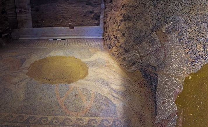 Το ψηφιδωτό αποκαλύφθηκε κατά την αφαίρεση μέρους της επίχωσης, που είναι σε εξέλιξη και σύμφωνα με την ανακοίνωση του υπουργείου Πολιτισμού, καλύπτει όλη την επιφάνεια του χώρου δηλαδή 4,5μ. πλάτος επί 3 μ. μήκος. Είναι κατασκευασμένο από μικρά βότσαλα, λευκού, μαύρου, γκριζωπού, μπλε, κόκκινου και κίτρινου χρώματος.