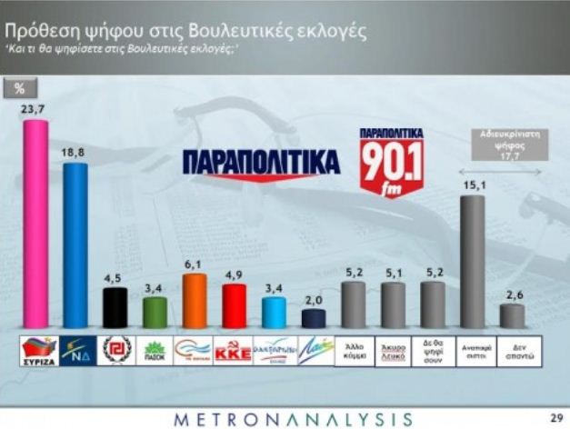 Συγκεκριμένα, στην πρόθεση ψήφου, ο ΣΥΡΙΖΑ συγκεντρώνει ποσοστό 23,7%, έναντι 18,8% της ΝΔ. Το Ποτάμι καταλαμβάνει την τρίτη θέση με 6,1%, ακολουθεί το ΚΚΕ με 4,9%, ενώ η Χρυσή Αυγή περιορίζεται στην πέμπτη θέση με ποσοστό 4,5%. Από 3,4 % “παίρνουν” το ΠΑΣΟΚ και οι Ανεξάρτητοι Έλληνες και για πρώτη φορά “εμφανίζεται” στον πίνακα ο ΛΑΟΣ, συγκεντρώνοντας ποσοστό 2%.