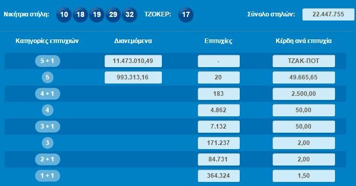 10, 18, 19, 29, 32 και τζόκερ το 17
