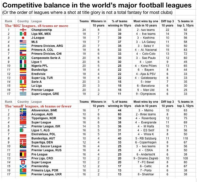 Από τις 18 ομάδες που συμμετάσχουν στη Σούπερ Λιγκ, μόλις δύο έχουν φτάσει την κατάκτηση του τίτλου την τελευταία δεκαετία (9 ο Ολυμπιακός και μια ο Παναθηναϊκός), ενώ μόλις έξι ομάδες έχουν τερματίσει στην πρώτη τριάδα της βαθμολογίας σε αντίθεση με την Premier League όπου στην πρώτη τριάδα έχουν βρεθεί 22 διαφορετικές ομάδες!