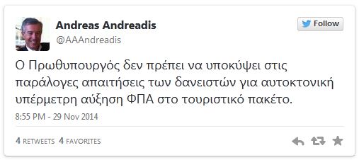 “Ο Πρωθυπουργός δεν πρέπει να υποκύψει στις παράλογες απαιτήσεις των δανειστών για αυτοκτονική υπέρμετρη αύξηση ΦΠΑ στο τουριστικό πακέτο” επανέλαβε πάντως, το Σάββατο το βράδυ μέσω του λογαριασμού του στο Twitter ο πρόεδρος του ΣΕΤΕ Ανδρέας Ανδρεάδης.