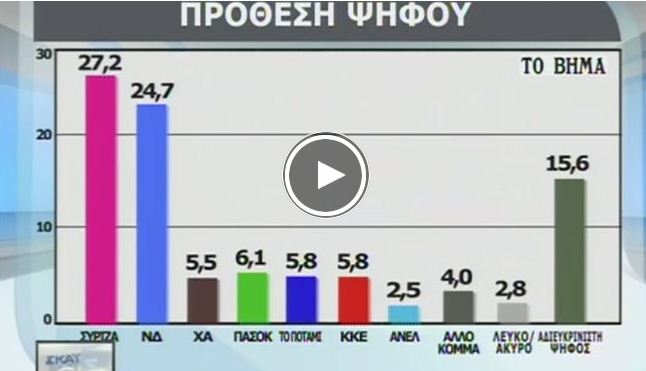 Αναπάντεχη τροπή, με χαρακτηριστικά εκλογικής αναμέτρησης – θρίλερ άλλων εποχών, φαίνεται να παίρνουν οι εκλογές για τους διεκδικητές της εξουσίας ΣΥΡΙΖΑ και ΝΔ -σύμφωνα με δημοσκοπήσεις που δημοσιεύονται σε δύο κυριακάτικες εφημερίδες- σε περίπτωση που τη Δευτέρα η Βουλή δεν εκλέξει Πρόεδρο της Δημοκρατίας.