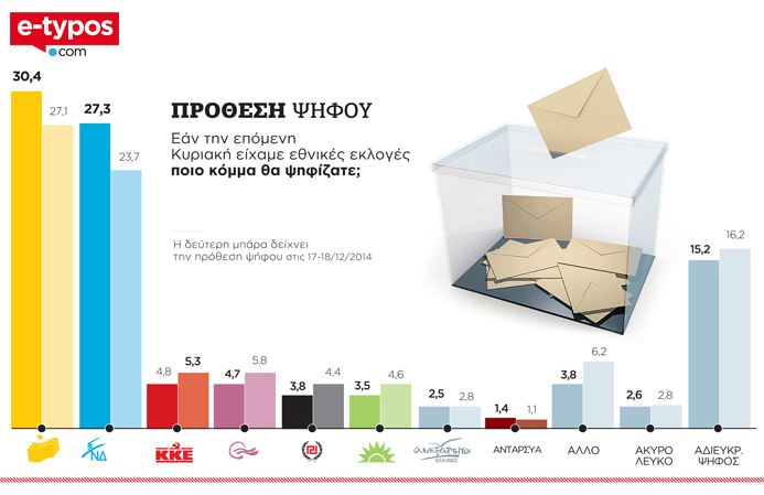 Στην ακτινογραφία της πρόθεσης ψήφου διαφαίνεται πόλωση του εκλογικού σώματος καθώς είναι ενδεικτικό πως σε σχέση με την προηγούμενη καταγραφή της πρόθεσης ψήφου το άθροισμα των ποσοστών των δύο πρώτων κομμάτων (ΣΥΡΙΖΑ – Ν.Δ.) εμφανίζεται αυξημένο κατά 6,9% ενώ παράλληλα εμφάνισαν μείωση τα ποσοστά των μικρότερων κομμάτων καθώς κανένα δεν καταγράφεται σε ποσοστό μεγαλύτερο του 5%. Συγκεκριμένα, ο ΣΥΡΙΖΑ συγκεντρώνει 30,4%, η Ν.Δ. 27,3%, τρίτο κόμμα το ΚΚΕ με 4,8%, ακολουθεί το Ποτάμι με 4,7%, η Χρυσή Αυγή με 3,8%, το ΠΑΣΟΚ με 3,5%.