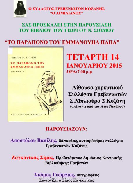 Ο Σύλλογος Γρεβενιωτών Κοζάνης “Ο ΑΙΜΙΛΙΑΝΟΣ” σας προσκαλεί στην παρουσίαση του βιβλίου του Γιώργου Ν. Σιώμου “ΤΟ ΠΑΡΑΠΟΝΟ ΤΟΥ ΕΜΜΑΝΟΥΗΛ ΠΑΠΑ” που θα πραγματοποιηθεί την Τετάρτη 14 Ιανουαρίου 2015, στις 7:00 μ.μ στην αίθουσα του χορευτικού Συλλόγου Γρεβενιωτών Κοζάνης Σ. Μπλιούρα 2 (απέναντι από τον Άγιο Νικόλαο).