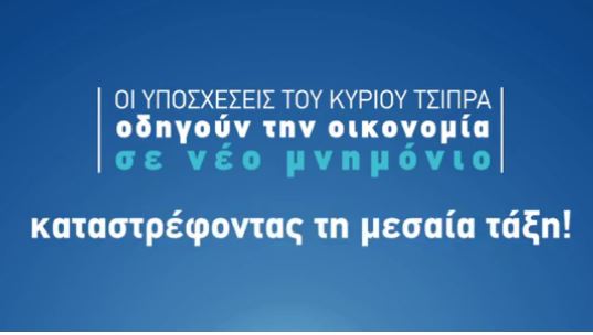 Ενώ το δεύτερο με τον τίτλο «Οι υποσχέσεις τους καταστρέφουν τη μεσαία τάξη» έχει την δήλωση του υπεύθυνου Οικονομικών της Κουμουνδούρου Ευκλείδη Τσακαλώτου, υποστηρίζοντας ότι ο ΣΥΡΙΖΑ ως κυβέρνηση θα αυξήσει τους φόρους στο σύνολο των εισοδημάτων και της περιουσίας με συντελεστή 60%.