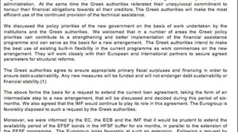 «Σε αυτή τη βάση οι ελληνικές αρχές εξέφρασαν την πρόθεσή τους να ζητήσουν 6μηνη τεχνική παράταση του τρέχοντος προγράμματος σαν ένα μεταβατικό βήμα. Αυτό θα γεφυρώσει τον χρόνο προκειμένου οι ελληνικές αρχές και το Eurogroup να εργαστούν σε μια νεότερη (follow-up) συμφωνία». Συμφωνήσαμε επίσης ότι το ΔΝΤ θα συνεχίσει να διαδραματίζει το ρόλο του στη νέα συμφωνία. Το Eurogroup διάκειται θετικά σε ένα τέτοιο αίτημα από τις εληνικές αρχές».