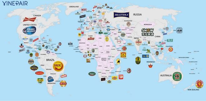 Σε ό,τι αφορά τώρα τα στοιχεία για τις πιο δημοφιλείς μάρκες ανά τον πλανήτη, ο χάρτης διαμορφώνεται ως εξής (δεν παρουσιάζονται οι χώρες για τις οποίες το Euromonitor δεν έχει στοιχεία στη διάθεση του). Καταγράφονται οι εγχώριες μπύρες ανά κράτος: