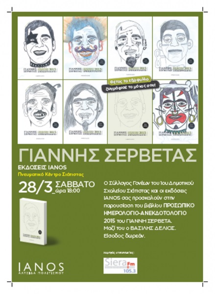 Η Παρουσίαση του Βιβλίου «Προσωπικό Ημερολόγιο-Ανεκδοτολόγιο 2015» του Γιάννη Σερβετά, που ήταν προγραμματισμένη να γίνει σήμερα Σάββατο 28 Μαρτίου στις 18:00 μ.μ.στο Πνευματικό Κέντρο Σιάτιστας, αναβάλλεται, λόγω πένθους του συγγραφέα.