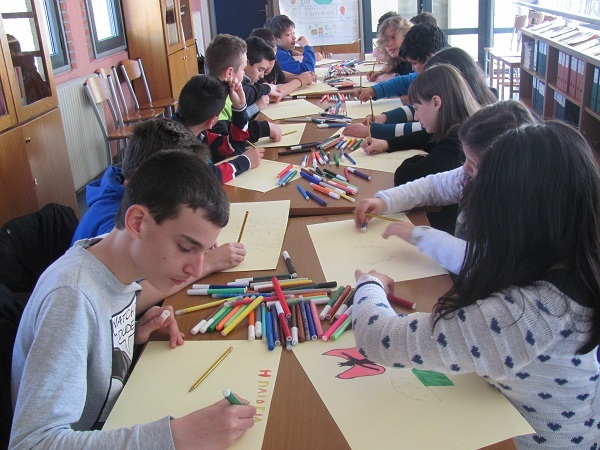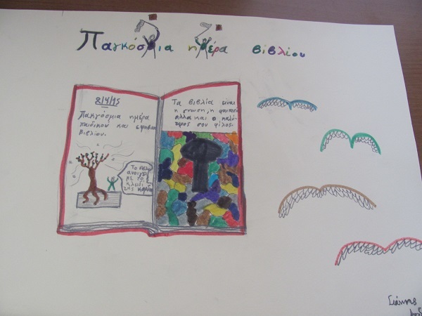 Στη συνέχεια αφού δόθηκε το ερέθισμα στα παιδιά με την ανάγνωση του ποιήματος, ζητήσαμε να φιλοτεχνήσουν το καθένα μια αφίσα και να γράψουν ένα ανάλογο μήνυμα για την ημέρα. Τα παιδιά αποτύπωσαν με έντονα χρώματα στο χαρτί ποιήματα, μηνύματα, ζωγραφιές και στίχους, την αγάπη τους για το βιβλίο, τη γνώση που προσφέρει και τα ταξίδια τους σε κόσμους μαγικούς.