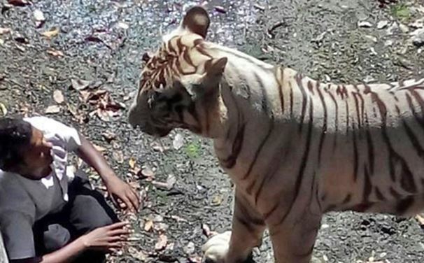 Ο 20χρονος άνδρας της φωτογραφίας πέρασε από δύο ή τρεις φράχτες για να φτάσει στην άκρη του χώρου όπου ζουν οι τίγρεις, στο ζωολογικό κήπο του Νέου Δελχί. Έπεσε όμως από τοίχο 5,5 μέτρων μέσα στο χώρο των τίγρεων. Η τίγρη της φωτογραφίας τον αντιλήφθηκε και έσπευσε να δει τι είχε συμβεί. Μπορείτε εύκολα να φανταστείτε τι ακολούθησε. Πέρασαν πάντως δύο ώρες μέχρι οι υπεύθυνοι του κήπου να οδηγήσουν την τίγρη πίσω στο κλουβί της και να ανασύρουν τη σορό.