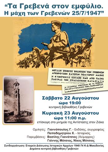 Η φετινή 8η Θεματική εκδήλωση της ΕΔΙΑ 1940-74 Κ. -Δ. Μακεδονίας, που διοργανώνεται σε συνεργασία με τη Δημόσια Κεντρική Βιβλιοθήκη των Γρεβενών (Πλατεία Ελευθερίας), το Σάββατο 22 Αυγούστου, στις 7μ.μ., είναι τιμητικά αφιερωμένη στους αγωνιστές/τριες της ευρύτερης περιοχής των Γρεβενών.