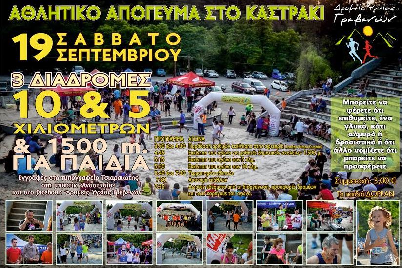 δρομεισ 2015Οι Δρομείς Υγείας Γρεβενών για να αποχαιρετήσουν το καλοκαίρι και να υποδεχτούν το φθινόπωρο, διοργανώνουν αγώνες ορεινού τρεξίματος για όλους, το Σάββατο 19 Σεπτεμβρίου 2015 στις 4:00 το απόγευμα στο Καστράκι.
