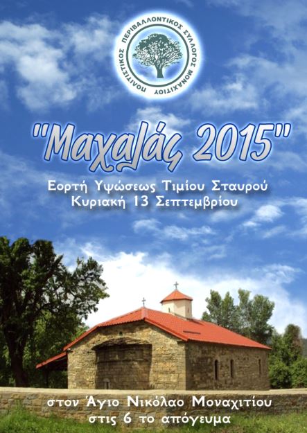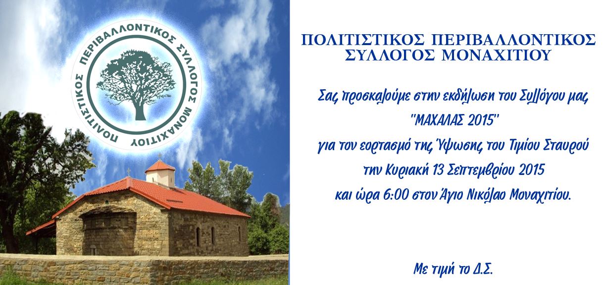 Ο Πολιτιστικός Περιβαλλοντικός Σύλλογος Μοναχιτίου, μας προσκαλεί στην γιορτή της Υψώσεως του Τιμίου Σταυρού με την επωνυμία “”Μαχαλάς 2015“.