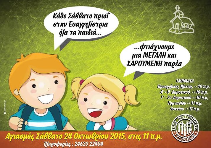 Το Σάββατο 24 Οκτωβρίου θα τελεστεί ο αγιασμός όλων των κατηχητικών ομάδων της Μητροπόλεώς μας, στις 11:00 το πρωί, στον Μητροπολιτικό Ναό της Ευαγγελίστριας. Κάθε Σάββατο πρωί, τα παιδιά της προσχολικής ηλικίας και του Δημοτικού, στις 10 το πρωί, και τα παιδιά του Γυμνασίου και Λυκείου στις 11 αντίστοιχα, θα μαζεύονται, για να δημιουργήσουν μία όμορφη και χαρούμενη παρέα, υπό την σκέπη της Εκκλησίας μας.