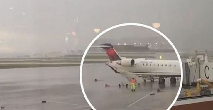 με τον αέρα να φυσά πολύ δυνατά. Ξαφνικά μέσα στο πλάνο μπαίνει μία… σκάλα επιβίβασης η οποία παρασυρμένη από τον δυνατό αέρα ορμά ακάθεκτη εναντίον ενός από τα σταθμευμένα αεροπλάνα.