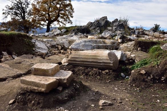 Στον ευρύ χώρο του τείχους της ακρόπολης, στη δυτική πλευρά της, αναγνωρίστηκαν τα λείψανα και τα θεμέλια ενός αξιόλογου κτηριακού συγκροτήματος που χρονολογείται στα τελευταία χρόνια του 4ου αι. π. Χ.: Στο μεγάλο πλάτωμα του υψώματος ο πετρόχτιστος ναός, η δωρική στοά και ένα μεγάλο ακόμη κτήριο συγκεντρώνονται γύρω από μία τετράπλευρη «πλατεία» και σε άμεση επαφή με την μεγάλη δυτική πύλη του οχυρωματικού περιβόλου που προστάτευε την ακρόπολη.