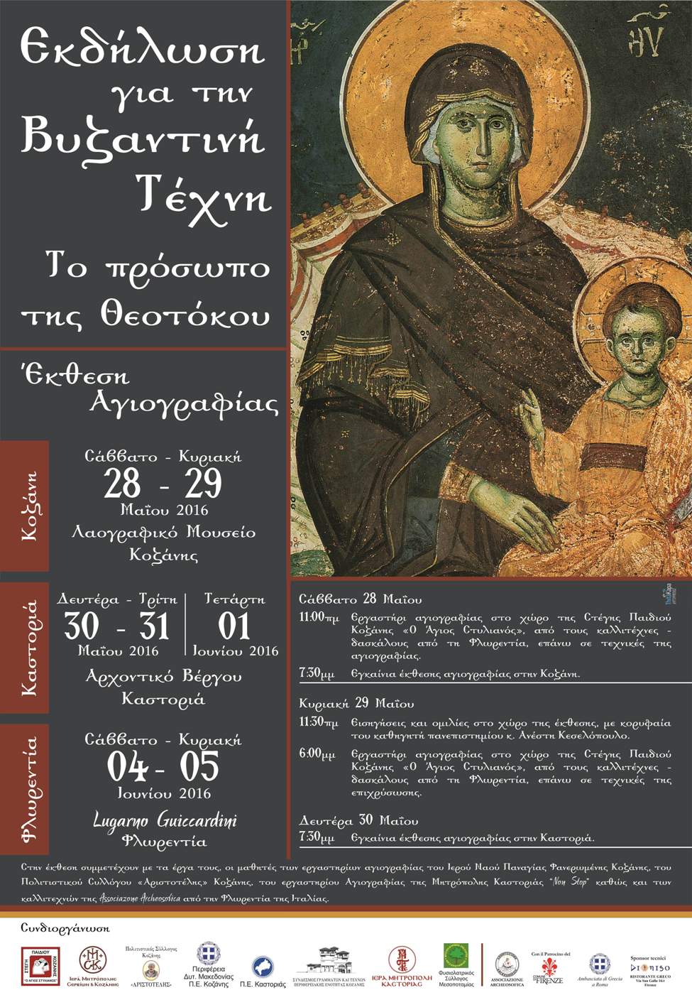 Η Περιφέρεια Δυτικής Μακεδονίας, η Περιφερειακή Ενότητα Κοζάνης και η Περιφερειακή ΕνότηταΚαστοριάς σε συνεργασία με τη Στέγη Παιδιού Κοζάνης «Ο Άγιος Στυλιανός», το Φυσιολατρικό Σύλλογο Μεσοποταμίας Καστοριάς και τα εργαστήρια αγιογραφίας του Ιερού Ναού Παναγίας Φανερωμένης Κοζάνης, του Πολιτιστικού Συλλόγου «Αριστοτέλης», του εργαστηρίου Αγιογραφίας της Μητρόπολης Καστοριάς “Non Stop” και του εργαστηρίου αγιογραφίας της «Associazione Archeosofica» στη Φλωρεντία, διοργανώνουν μία πρωτότυπη πολιτιστική εκδήλωση με κεντρικό άξονα την βυζαντινή τέχνη και τίτλο «Εκδήλωση για τη Βυζαντινή Τέχνη, το πρόσωπο της Θεοτόκου μέσα στο χρόνο». Τα εγκαίνια της εκδήλωσης θα πραγματοποιηθούν στις 28 Μαΐου στην Κοζάνη και στις 30 Μαΐου στην Καστοριά.