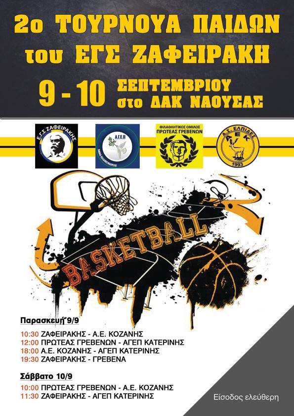 Την Παρασκευή 9/9 και Σάββατο 10/9 θα πραγματοποιηθεί τουρνουά μπάσκετ παίδων, στην Νάουσα με την συμμετοχή των: Φ.Ο.ΠΡΩΤΕΑ ΓΡΕΒΕΝΩΝ, Α.Γ.Ε.Π.ΚΑΤΕΡΙΝΗΣ, Α.Ε.ΚΟΖΑΝΗΣ και ΖΑΦΕΙΡΑΚΗ ΝΑΟΥΣΑΣ.