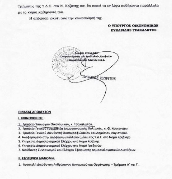 Με την Απόφαση του Υπουργού ορίζεται αναπληρωτής Προϊστάμενος της Υ.Δ.Ε του Νομού Γρεβενών ο Γεώργιος Καρακούλας του Αθανασίου που υπηρετεί ως Προϊστάμενος του Α΄ τμήματος της Υ.Δ.Ε στο Νομό Κοζάνης, ο οποίος και θα υπογράφει τα σχετικά εντάλματα.