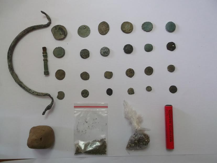Τα -32- αρχαία αντικείμενα που κατασχέθηκαν χρονολογούνται ότι ανήκουν στους Αρχαίους, Ρωμαϊκούς, Βυζαντινούς και Οθωμανικούς χρόνους- Επίσης, στην κατοχή του ενός συλληφθέντα βρέθηκαν και κατασχέθηκαν ποσότητες ναρκωτικών ουσιών, καθώς και -1- κροτίδα