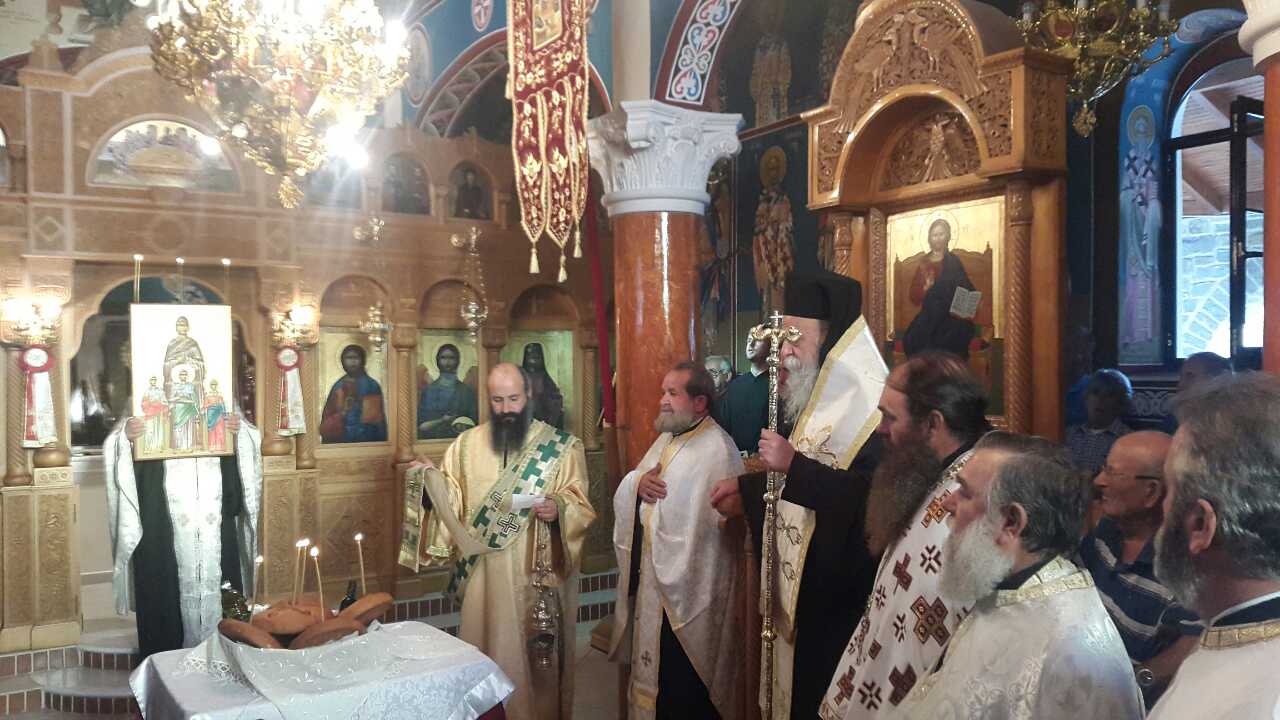 Στον Πανηγυρικό Αρχιερατικό Εσπερινό των Εγκαινίων που τελέστηκε την προηγούμενη ημέρα, ο Σεβασμιώτατος μετέφερε στον Ιερό Ναό ιερά λείψανα Αγίων Μαρτύρων, τα οποία κατά την τελετή των Εγκαινίων, αφού λιτανεύτηκαν γύρω από τον Ναό και μετά τις σχετικές ευχές και αναγνώσματα, επανήλθαν σ’ αυτόν και τοποθετήθηκαν σε ειδική οπή της Αγίας Τραπέζης όπου και σφραγίστηκαν με κηρομαστίχη και αρώματα για να αποτελέσουν το θεμέλιο του εγκαινιασμένου Ιερού Ναού.