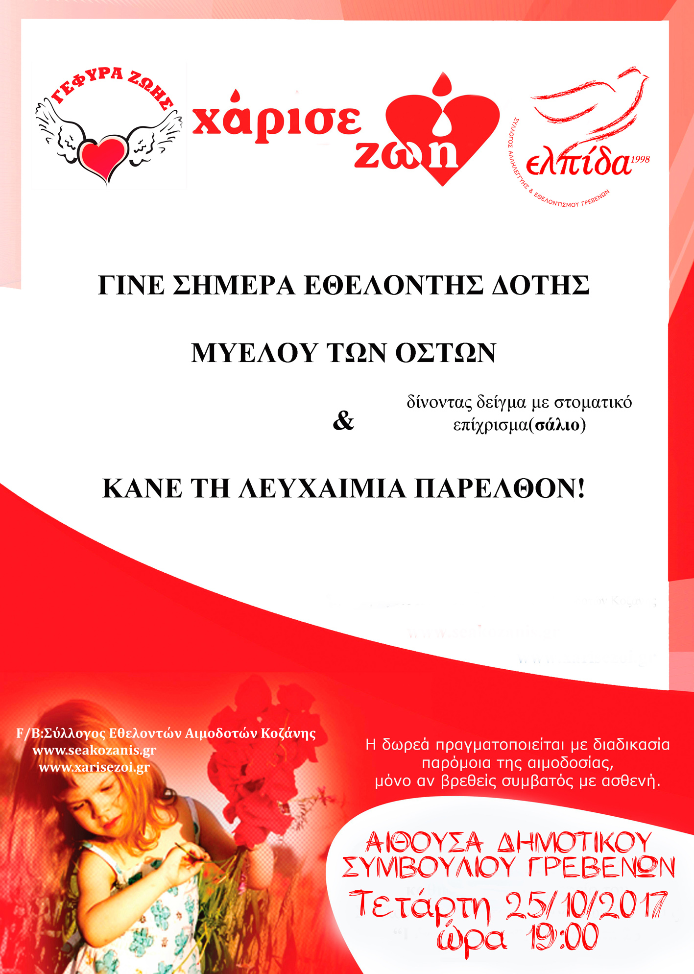Ο σύλλογος Γρεβενών «ΕΛΠΙΔΑ», σε συνεργασία με τον Σύλλογο εθελοντών αιμοδοτών Κοζάνης « Γέφυρα ζωής», σας προσκαλεί την Τετάρτη 25 Οκτωβρίου 2017 στις 19:00 μ.μ στην αίθουσα Δημοτικού Συμβουλίου Γρεβενών.