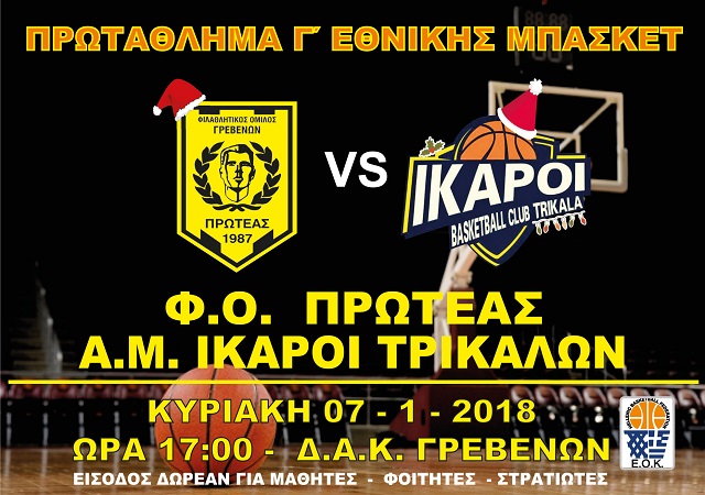 Τον Α.Μ. Ικαροι Τρικάλων αντιμετωπίζει η ανδρική ομάδα του Φ.Ο.Πρωτέα Γρεβενών στα πλαίσια της 11ης αγωνιστικής , για το πρωτάθλημα της Γ΄εθνικής.