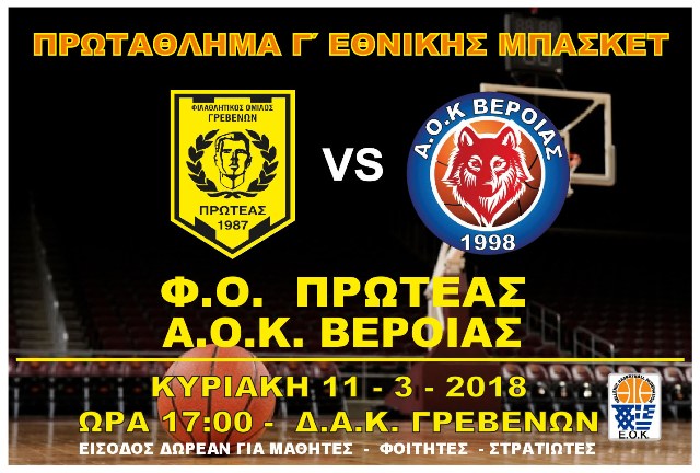 Τον Α.Ο.Κ. Βέροιας αντιμετωπίζει η ανδρική ομάδα του Φ.Ο.Πρωτέα Γρεβενών στα πλαίσια της 19ης αγωνιστικής , για το πρωτάθλημα της Γ΄εθνικής.Ο αγώνας θα διεξαχθεί την Κυριακή 11-3-2018 και ώρα 17:00 στο ΔΑΚ Γρεβενών.