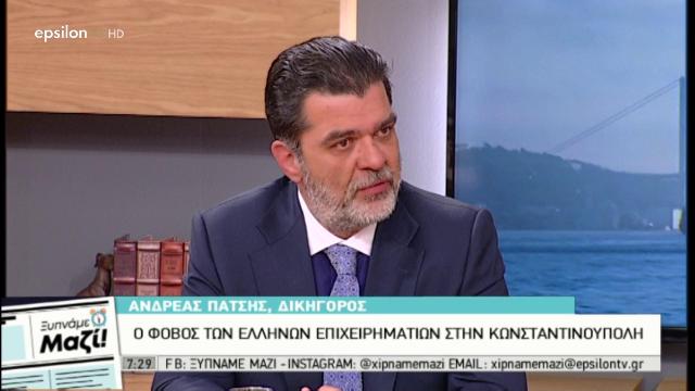 Για το πλέγμα των εξελίξεων στα ελληνοτουρκικά και το πόσο έχουν επηρεάσει τις ελληνικές επιχειρήσεις στην Κωνσταντινούπολη, αλλά και για το μείζον θέμα της τουριστικής ανάπτυξης στη χώρα μας, μίλησε ο γνωστός δικηγόρος Ανδρέας Πάτσης, στον Σπύρο Χαριτάτο και στην εκπομπή της τηλεόρασης του Epsilon «Ξυπνάμε Μαζί».