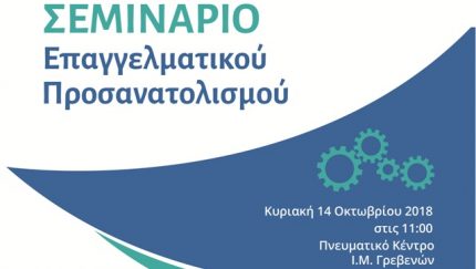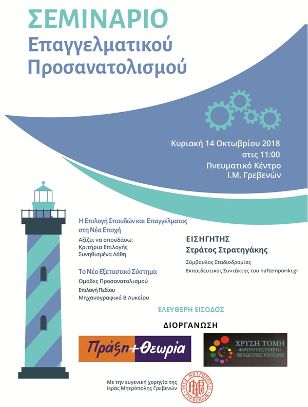 Τα φροντιστήρια Πράξη & Θεωρία και Χρυσή Τομή, που εκπροσωπούν τον σύλλογο φροντιστών Δυτικής Μακεδονίας στα Γρεβενά σας προσκαλούν στην εκδήλωση επαγγελματικού προσανατολισμού που διοργανώνουν στην αίθουσα εκδηλώσεων του Πνευματικού Κέντρου της Ιεράς Μητροπόλεως, την Κυριακή 14/10/2018 και ώρα 11:00 π.μ. με εισηγητή τον κ. Σ. Στρατηγάκη.