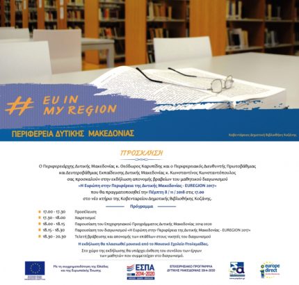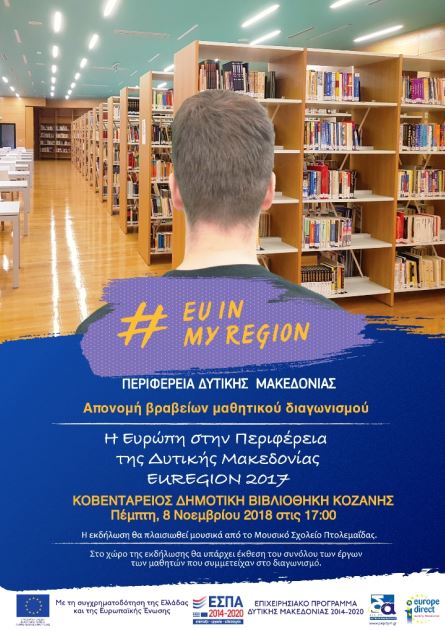 Ανοιχτή εκδήλωση απονομής βραβείων του μαθητικού διαγωνισμού «Η Ευρώπη στην Περιφέρεια της Δυτικής Μακεδονίας – EUREGION 2017» θα πραγματοποιηθεί την Πέμπτη 08 Νοεμβρίου 2018, στις 17:00, στο νέο κτήριο της Κοβενταρείου Δημοτικής Βιβλιοθήκης Κοζάνης.