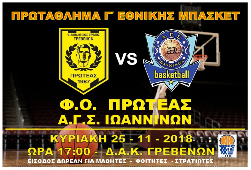 Τον Α.Γ.Σ.Ιωαννίνων θα αντιμετωπίσει η ανδρική ομάδα του Φ.Ο.Πρωτέα Γρεβενών , σήμερα Κυριακή 25-11-2018 & ώρα 17:00 στο ΔΑΚ Γρεβενών, στο μεγάλο ντέρμπυ της 6ης αγωνστικής του πρωταθλήματος μπάσκετ της Γ΄Έθνικής(3ος όμιλος).