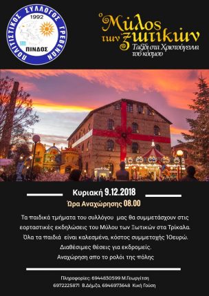 Στο μεγαλύτερο θεματικό χριστουγεννιάτικο πάρκο της Ελλάδας, στο Μύλο των Ξωτικών στα Τρίκαλα θα ταξιδέψει το παιδικό τμήμα του Συλλόγου μας την Κυριακή 9.12.2018.