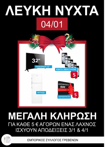Την Παρασκευή 4 Ιανουαρίου 2019 επιλέγοντας τα καταστήματα με την αφίσα της «Λευκής Νύχτας», θα έχετε την δυνατότητα να μετατρέψετε δωρεάν τις αποδείξεις σας σε λαχνούς ώστε να συμμετέχετε στην μεγάλη μας κλήρωση.