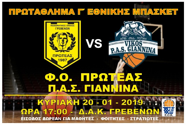 Τον Π.Α.Σ.Γιάννινα θα αντιμετωπίσει η ανδρική ομάδα του Φ.Ο.Πρωτέα Γρεβενών ,την Κυριακή 20-1-2019 & ώρα 17:00 στο ΔΑΚ Γρεβενών,στο μεγάλο ντέρμπυ κορυφής , της 12ης αγωνιστικής του πρωταθλήματος μπάσκετ της Γ’ Εθνικής(3ος όμιλος).