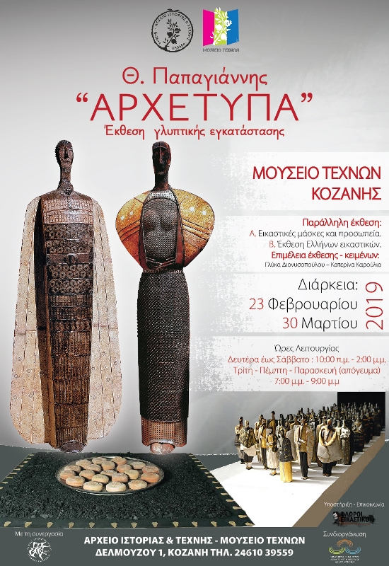 Ο Πρόεδρος και τα μέλη του Δ.Σ. του Αρχείου Ιστορίας & Τέχνης, σας προσκαλούν να τιμήσετε με την παρουσία σας την πρώτη εναρκτήρια έκθεση που διοργανώνουμε στο Νέο ιδρυθέν ¨ΜΟΥΣΕΙΟ ΤΕΧΝΩΝ¨ στην πόλη της Κοζάνης. με γενικό τίτλο «ΑΡΧΕΤΥΠΑ» με γλυπτά του μεγάλου Έλληνα γλύπτη Θεόδωρου Παπαγιάννη. Μαζί του συμμετέχουν με δικά τους έργα τέχνης και άλλοι Έλληνες Εικαστικοί. Στο χώρο θα φιλοξενηθούν επίσης, προσωπεία (μάσκες) λαϊκών μεταμφιέσεων από διάφορες περιοχές του Ελλαδικού χώρου σε μια ¨συνομιλία¨ με τα γλυπτά του Θ. Παπαγιάννη,.