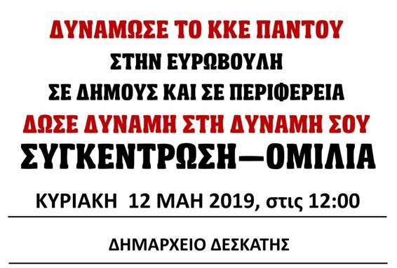 Η ΚΟ Δεσκάτηςτου ΚΚΕ διοργανώνει πολιτική συγκέντρωση στο Δημαρχείο Δεσκάτης την Κυριακή 12 Μάη στις 12 το μεσημέρι.