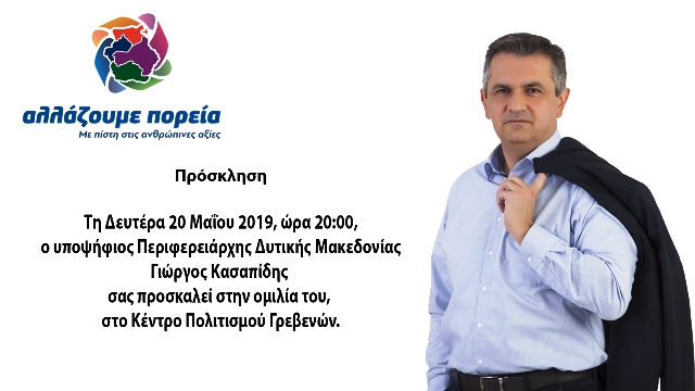 Τη Δευτέρα 20 Μαΐου 2019, ώρα 20:00, ο υποψήφιος Περιφερειάρχης Δυτικής Μακεδονίας Γιώργος Κασαπίδης θα παρουσιάσει το όραμα του για την Περιφέρεια και βασικούς άξονες του προγράμματός του, σε ομιλία που θα πραγματοποιήσει στο Κέντρο Πολιτισμού Γρεβενών.